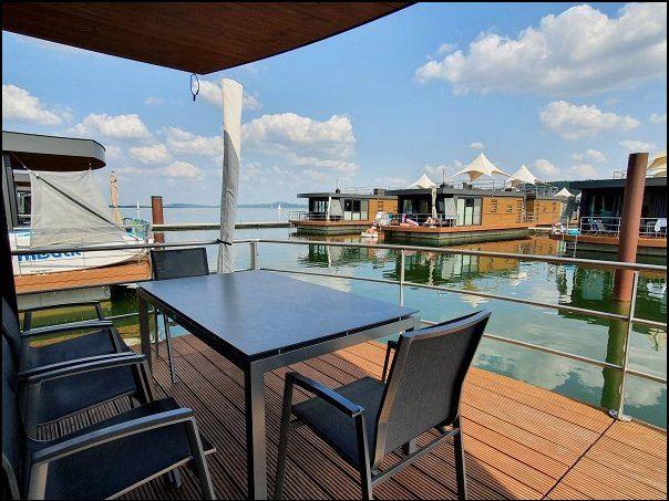Im Wohnbereich findet man eine große Couch, die ggf. zu einer weiteren Schlafmöglichkeit umgeklappt werden kann. Dazu ein großer Esstisch. Das gesamte Haus besteht aus Glasfronten und -türen, so dass man quasi von überall einen Blick aufs Wasser hat. Einmal durch den Raum hindurch, betritt man die Floating-Terrasse und genießt von hier aus einen fantastischen Blick auf den See und/oder den Yacht-Hafen sowie auf die übrigen Floating-Villen. Die Terrasse bietet einen Tisch mit sechs Stühlen, zudem sind zwei Liegen vorhanden sowie ein Sonnensegel und ein ausklappbarer Schirm.