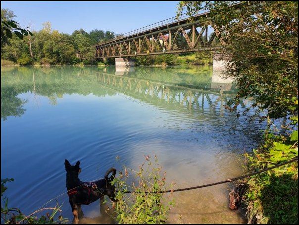 Einige hundert Meter weiter erreichten wir die alte Eisenbahnbrücke, über die noch immer die Züge rollen und unter der man tatsächlich auch noch spazieren kann. Wir verzichteten mit den Hunden darauf. Die Brücke an sich ist aber tatsächlich ein schönes Fotomotiv.