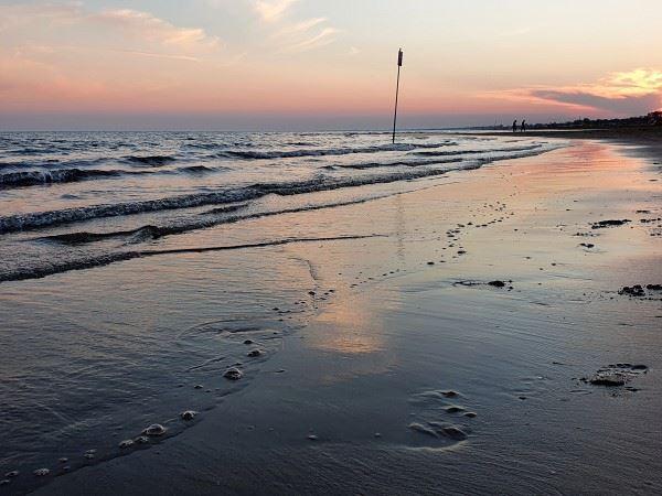 Die Größe des Strandes faszinierte mich. Natürlich hatte ich schon viele Bilder von den mit Menschenmassen gefluteten Stränden an der Adria gesehen. Aber so groß hatte ich es mir nicht vorgestellt. Liegen waren einige vorhanden – die Leute hielten sich aber in Grenzen und so genoss ich einen herrlichen Sonnenuntergang am Meer.