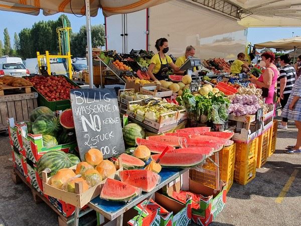 Das Frühstück fiel heute etwas kürzer aus und auch den langen Gassi-Gang am Morgen verschoben wir auf später, denn in Bibione war Markttag. Und das nur von 9 bis 13 Uhr. Und da wollte ich heute hin. Zum Glück hatten uns unsere Nachbarn darauf hingewiesen, denn ich selbst hatte bisher nichts davon gelesen. Ein guter Tipp!