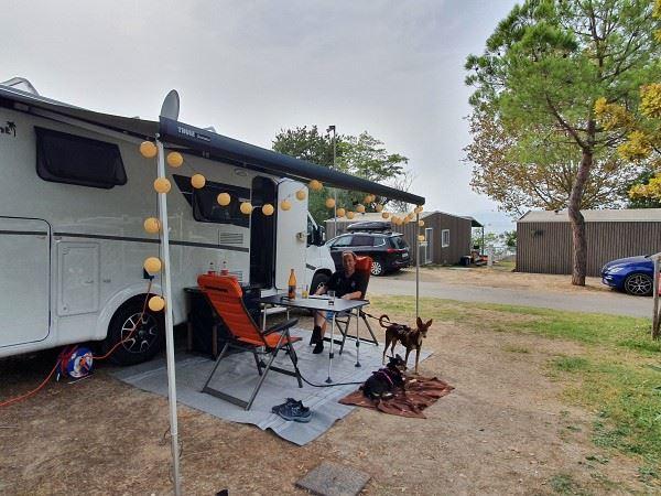 Angemeldet und die Stellplatznummer in Empfang genommen, wurden wir von einem Mitarbeiter der Anlage direkt zum Platz geführt. Dank der Größe von 80 qm war das Einparken in wenigen Sekunden erledigt. Von der Anmeldung an der Rezeption über Aufbauen der Möbel bis zum ersten Kaffee dauerte es keine Stunde. Perfekt!