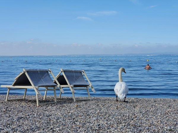 Die Stimmung am See war herrlich. Aufgrund des bewölkten Wetters hatten sich die meisten Leute auf Ausflüge gemacht und so war es am Strand überall ziemlich leer. Lediglich Hundebesitzer waren anzutreffen und natürlich auch der ein oder andere Radfahrer. Immer wieder blieb ich stehen, machte Fotos von Muscheln, Schwänen und der Landschaft. Ich erreichte eine Werft, begutachtete die tollen Boote, die hier standen und lief anschließend noch weiter nach Pacengo.