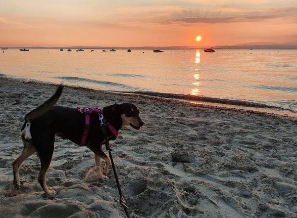 Auch jetzt buddelte Benita wieder ausgelassen im Sand, sprang herum und war einfach nur happy. Doch kurz nachdem die Sonne untergegangen war und wir eigentlich noch einen kleinen Spaziergang unternehmen wollten, merkten wir, wie müde sie doch tatsächlich war. Die Woche hatte den Hunden einiges abverlangt. Zuhause sind wir Alltags bedingt bei Weitem nicht so viel unterwegs; natürlich schlaucht das die Hunde irgendwann. Benita warf mir einen leicht flehenden Blick zu, doch nicht mehr allzu weit zu spazieren und so ging es auch geradewegs wieder zum Camper zurück.