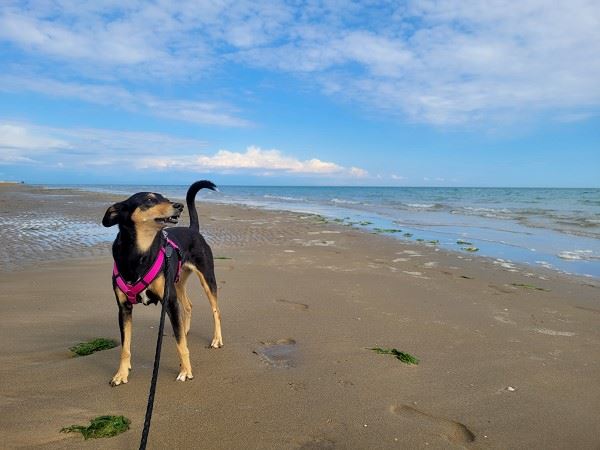 Nach einer kurzen Pause am Platz ging es nun erneut mit den Hunden in den Ort. Ein weiterer Test für Mia. Mal sehen wie weit wir es heute mit ihr schaffen würden. Mia hasst Städte und damals kamen wir nicht weit mit ihr. Restaurants und Läden machen ihr Angst. Heute ging es mit etwas Überredungskunst ein Stückchen weiter. Überanstrengen wollten wir sie allerdings nicht, sie war doch ziemlich angespannt, und so drehten wir nach einiger Zeit wieder ab in Richtung Strand. Prompt war ihre gute Laune zurückgekehrt.