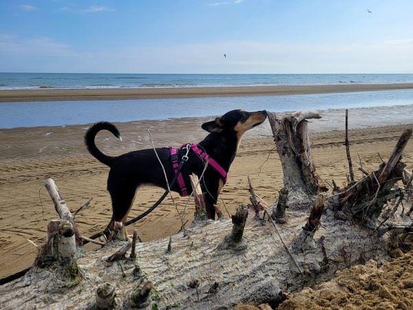 Den ersten Kaffee und vor allem die warmen Sonnenstrahlen genossen, ging es gegen 16 Uhr auf einen ausgedehnten Spaziergang mit den Hunden. Raus aus dem Campingplatzgelände und ab zum Strand. Bis zum 01.05. darf man mit dem Hunden auch tagsüber an den Strand – auch ein Grund, weshalb wir um diese Zeit an die Adria fuhren. Benita liebt Strand und Sand und so soll sie das auch ein- bis zweimal im Jahr ausgiebig genießen, toben und buddeln.