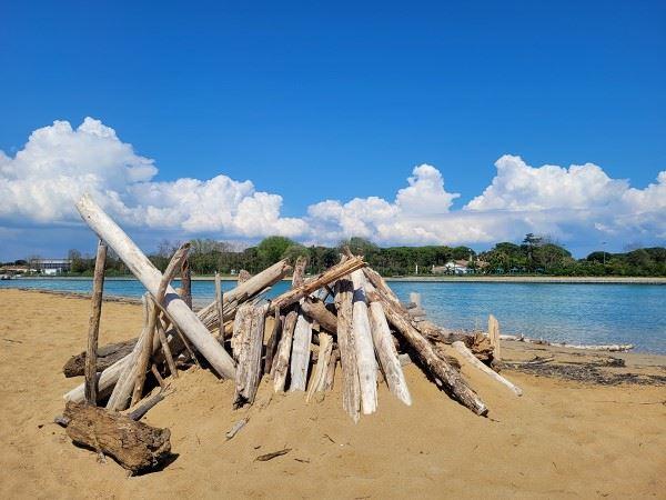 Die Fähre, die vom Fiume Tagliamente nach Lignano übersetzt, startet erst ab Mai. Heute fanden noch Bauarbeiten statt. Letzten Sommer gab es hier einen verheerenden Waldbrand, der sowohl einen Teil des Waldes als auch die Anlegestelle in Schutt und Asche legte. Die komplett verkohlten Bäume sprachen Bände.
