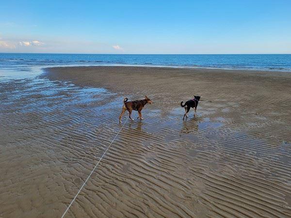 Als Belohnung gab es anschließendes Kuscheln vor dem Camper, danach drehten wir erneut eine etwas längere Gassi-Runde und tobten uns noch einmal so richtig am Strand aus. Dank der langen Flexi-Leinen konnten sie sich auch etwas weiter entfernen.