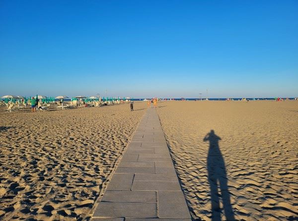 Die knapp 8 km legt man auf schönen, ausgebauten, Radwegen entlang der Lungomare Alberto Kechler, teilweise direkt mit Blick auf's Meer, teilweise auch durch kleine Waldstücke und entlang einer Hotel-Meile zurück. Dieses Mal war schon deutlich mehr los.