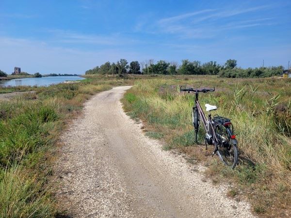 Ursprünglich hatte ich geplant, einmal um die Lagunen in das Städtchen Comacchio zu fahren. Doch der Weg zog sich ganz schön, es sah kürzer aus als es tatsächlich war und weil die Sonne unerbittlich auf mich herunter brannte und ich auch nichts mehr zu Trinken dabei hatte, drehte ich schließlich um und legte an der Stazione Foce eine Pause ein.