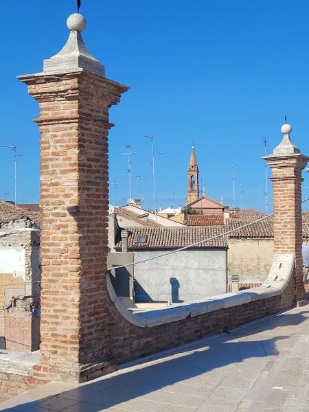 Über die Ponte degli Sbirri bog ich nach links ab und erreichte rechter Hand das beeindruckende Gebäude der Musik-Schule von Comacchio (einst das Gefängnis), auf der linken Seite die alte Fischhalle, die jedoch nur noch gelegentlich auch als solche genutzt wird. Heute fand ich nur eine Kunstausstellung vor. Ein Schritt nach draußen und ich stand vor der beeindruckenden Ponte dei Trepponti. Was für ein wuchtiges Bauchwerk!