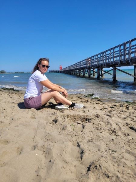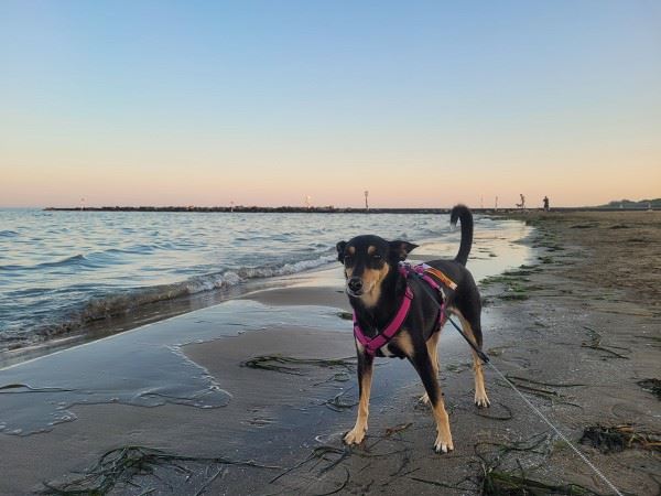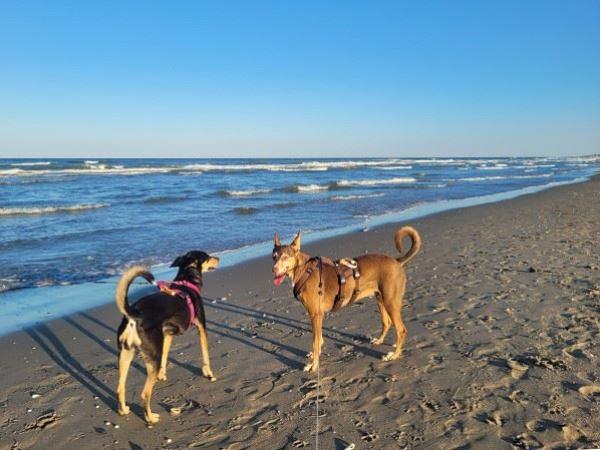 Mit unseren beiden Damen ging es nun auf einen langen Spaziergang durch einen Teil des Campingplatzes und darüber hinaus. Auch dem Strand statteten wir einen kurzen Besuch ab. Benita war richtig happy, als sie den Sand unter ihren Pfötchen spürte und stolzierte fast schon grinsend durch die Gegend. Für Mia war es auch heute immer noch eine kleine Herausforderung, die sie jedoch Stück für Stück meisterte.