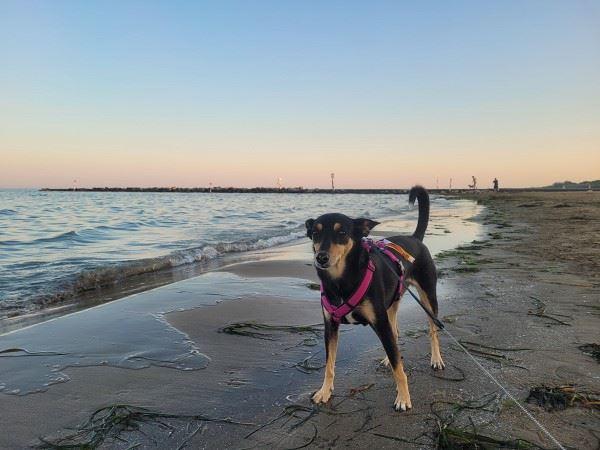 Gesagt getan. Nach Erledigung der 'Hausarbeiten' spazierten wir los zum knapp drei Kilometer entfernten Hundepark Pineta for Dogs in der Lungomare Alberto Kechler. Ehrlich gesagt war ich mir nicht sicher, ob das mit Mia funktioniert und stellte mich schon darauf ein, nach wenigen Minuten umzudrehen. Wir mussten durch einen Teil der Stadt. Und wer unsere Berichte verfolgt, weiß: Mia mag keine Städte. Ein Versuch war es aber wert und tatsächlich: Obwohl sie natürlich ziemlich angespannt war und hier und dort etwas verschreckt auf die Seite sprang: Sie meisterte den kompletten Weg, wollte kein einziges Mal zurück, war immer vorne mit dabei. Vielleicht lag es auch an der Anwesenheit eines weiteren – fremden – Hundes? Wir wissen es nicht, aber als wir nach einer guten Stunde an unserem Ziel ankamen, war ich mächtig stolz auf unsere Kleine.
