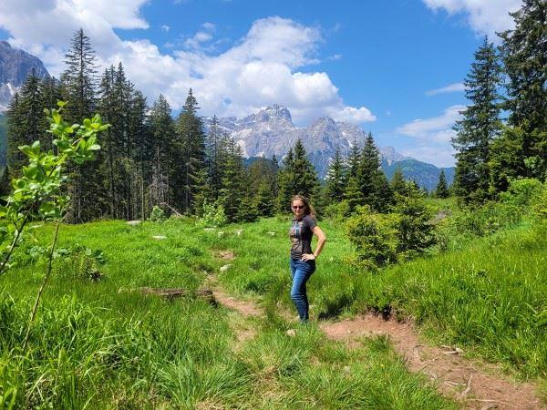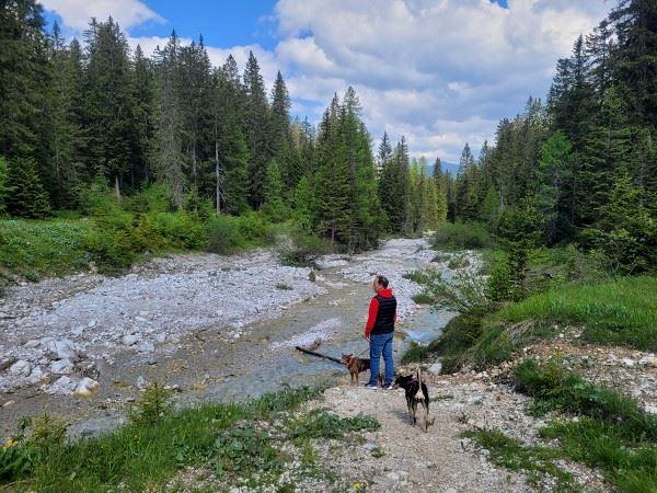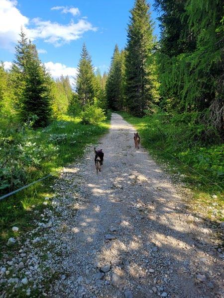 Die Hunde konnten es schon gar nicht mehr erwarten, so dass wir kurze Zeit später dann auch schon aufbrachen. Gleich den Wanderweg hinter unserem Stellplatz betreten, ging es nun eine ganze Weile durch den Wald. Mit tollen Ausblicken auf die umliegenden Berge und den Fluss. Irgendwie konnte ich mich hier an der Landschaft gar nicht sattsehen. Die Berge in den Dolomiten sind einfach doch nochmal was anderes als bei uns im Chiemgau oder im Berchtesgadener Land.