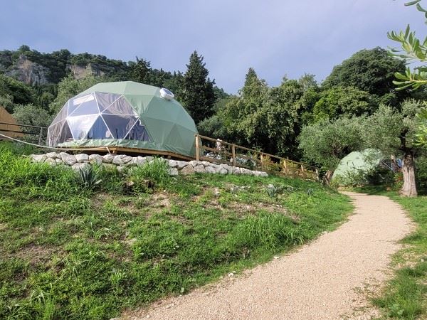 Für heute allerdings war kein Ausflug mehr geplant. Stattdessen streifte ich eine gute Stunde durch die Anlage und sah mir den Campingplatz ganz genau an, machte zahlreiche Fotos und Videos und kam schließlich begeistert zurück. Der Platz ist in zwei Bereiche unterteilt. Im unteren Teil am See findet man die Stellplätze für Wohnmobile und -wägen, es gibt einen Supermarkt, ein Restaurant sowie einen großen Pool. Oberhalb der Hauptstraße (ein Tunnel führt unter der Straße hindurch) sind Mobilehomes unterschiedlicher Klassen zu finden, aber auch Glampingzelte und – seit kurzem – sog. Garda-Bubbles. Drei miteinander verbundene Räume mit Panoramakuppeln sowie Whirlpool und Terrasse. Ein ganz eigener und exklusiver Bereich, der ganz viel Erholung verspricht. Auch hier ist ein Pool angesiedelt, es gibt einen Hundeplatz sowie Sportbereiche. Dieser Bereich ist ziemlich steil und man muss gut zu Fuß sein. Spaziert man den Hang immer weiter nach oben, erreicht man schließlich noch den hauseigenen 'Wildtierpark' mit Alpakas, Eseln, Hasen, Bienen und Ziegen/Schafen. Und von überall genießt man einen fantastischen Ausblick auf den Gardasee!