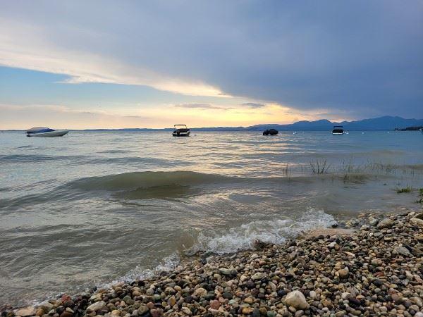 Nach dem Abendessen kühlte es endlich ein klein wenig ab, auch die Leute waren wieder von See und Wegen verschwunden und so spazierten wir zum Sonnenuntergang am Wasser entlang in Richtung Garda. Kaum näherten wir uns dem Ort, verfiel Mia wieder in leichte Panik und so drehten wir kurz davor wieder um, um den restlichen Abend bei Wein und Käse am Platz ausklingen zu lassen.