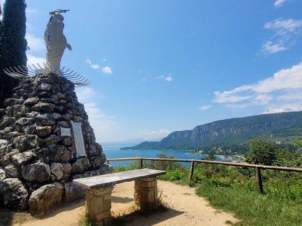 Ich drehte um, spazierte den Weg zurück und genoss tolle Ausblicke auf die Weinanbaugebiete drum herum. Erneut an der Weggabelung mit Picknickbänken angekommen, ging es wieder zurück zur Kirche Parrocchia di Santa Maria Assunta, kurz vorher bog ich aber noch einmal einen etwas versteckten Weg zur Madonna del Pign ab. Entlang eines winzig kleinen Trampelpfades erreicht man nach wenigen Minuten die wunderschöne Madonnen-Statue und hat von hier aus nochmals einen grandiosen Ausblick auf Garda. Die Schutzhelferin wurde von den Bürgern Gardas als Dank für die Rettung der Stadt vor Bombenangriffen im Zweiten Weltkrieg aufgestellt.