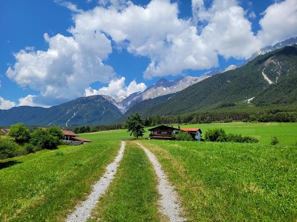 Nach einem sehr gemütlichen Frühstück unter freiem Himmel (ich liebe es!) ging es natürlich als erstes wieder mit den Hunden on Tour. Wir wählten den Weg in Richtung Telfs, auch wenn es nicht das Ziel war. Mit knapp 10 km einfache Strecke wäre das für unsere Hunde bei den sehr sommerlichen Temperaturen heute zu viel gewesen.