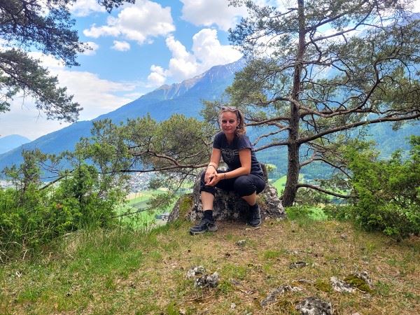 Eineinhalb Stunden später starteten wir dann auch schon los auf unsere erste Gassi-Runde. Bei blauem Himmel mit Sonnenschein und deutlich wärmeren Temperaturen als gedacht ging es durch den wunderschönen Föhrenwald. Die eher anspruchslosen Kiefern bilden dicht an dicht ein unglaublich tolles Bild. Generell wirkte der Wald sehr gepflegt und gar nicht so finster wie so manch anderer. Zwischendurch erhaschten wir tolle Ausblicke auf die umliegenden Berge.